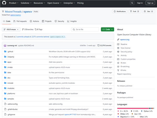 开发者只需将现有C++代码中的命名空间cv::cuda替换为cv::musa,即可在摩尔线程GPU上实现相同的功能。OpenCV-MUSA开源地址:https://github.com/MooreThreads/opencv